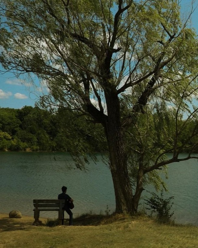 Evelyn sits on a weathered park bench quietly observing a passing family. Our color scheme primarily consists of black, white and gray to express the intense and varying emotions of the situation.