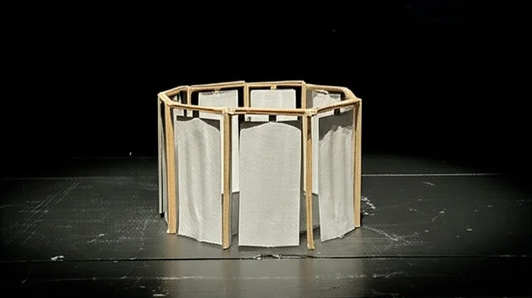 Placed in an abstract void Evelyn faces a towering, life-size zoetrope. Its paper-lined segments reflect flickering shadows, animating fragmented memories that reflect a prison of her past