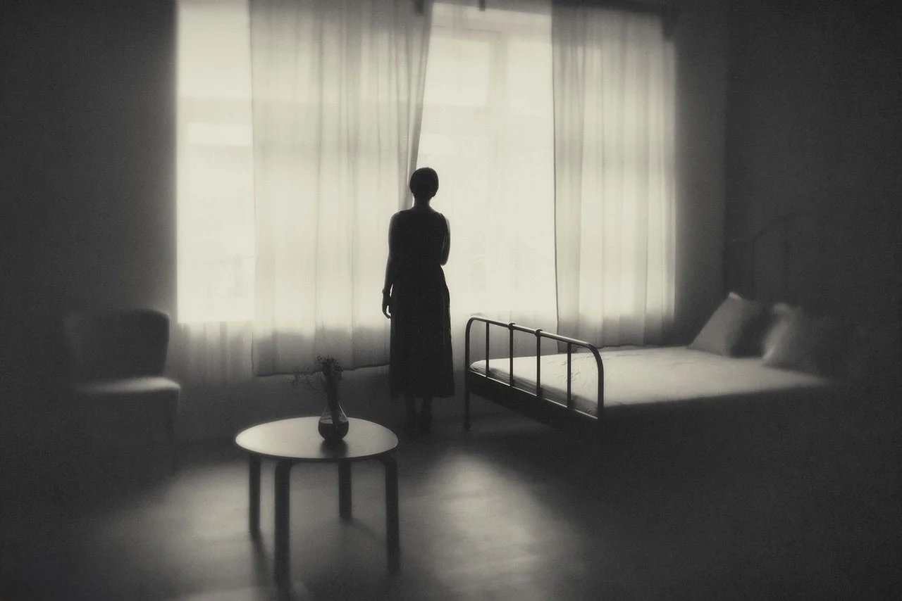 Evelyn's home becomes a surreal internal landscape: walls that hold memories, light leaking through unseen cracks, charged with a decades-old decision. Blinds open and close casting dynamic, prison-bar shadows—a visual echo of the zoetrope's cyclical entrapment.
